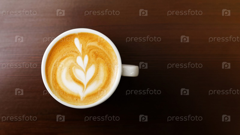 Белые чашки кофе капучино на темном деревянном фоне. Вид сверху с копией пространства