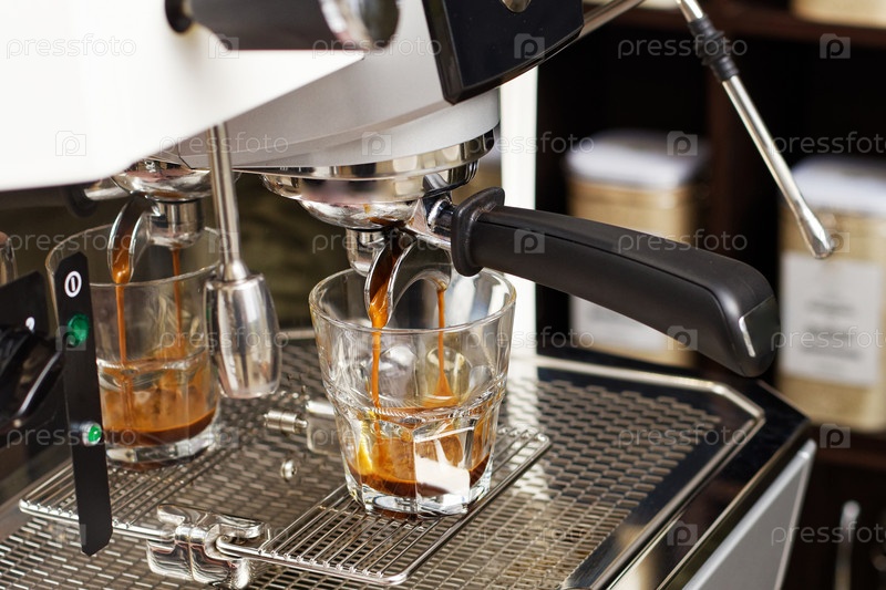 Заваривание кофе в кофемашине. Эспрессо разливается по стеклянным чашкам для плоско-белого кофе. Мелкий фокус