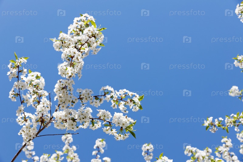 Крупным планом цветущая вишневая ветвь на фоне голубого неба. Мелкий фокус. Копипространство