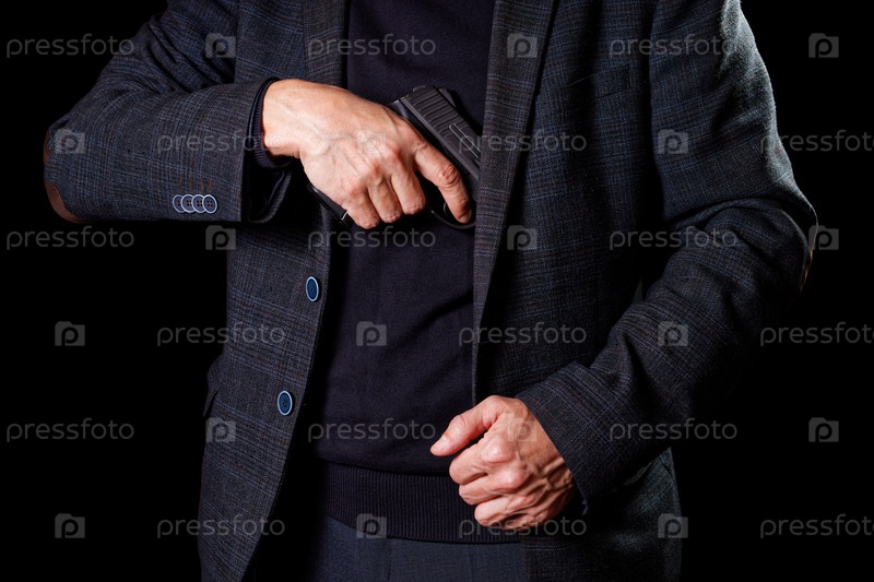 Мужчина в костюме достает пистолет из куртки в темноте