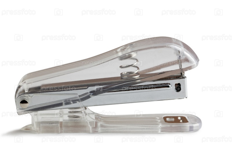 Бумажный степлер с полупрозрачной пластиковой ручкой на белом фоне