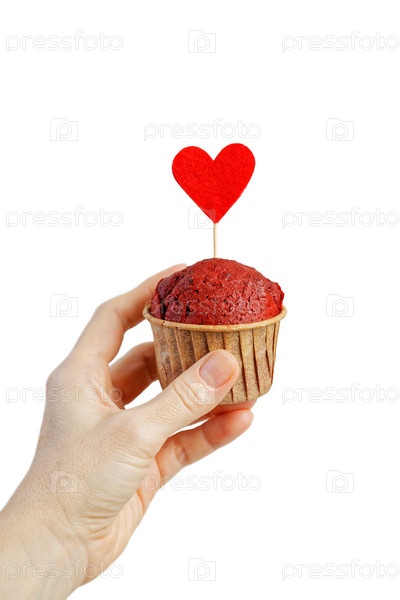 Крупным планом рука держит красный бархатный кекс, украшенный красным войлочным сердцем на белом фоне