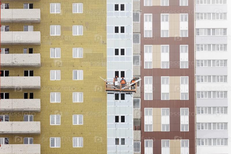 Строится высотное здание. Строители занимаются внешней отделкой стен здания