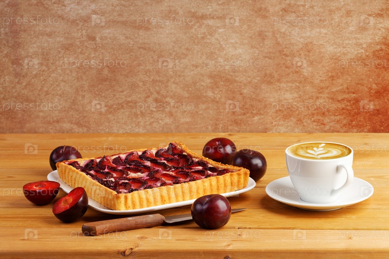 Домашний сливовый пирог и чашка кофе капучино на деревянном столе. Копипространство