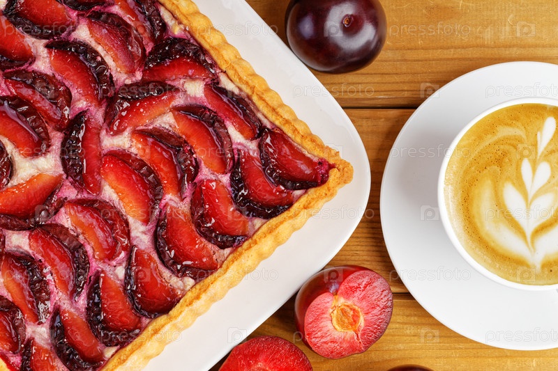 Крупный план домашний сливовый пирог и чашка кофе капучино на деревянном столе. Вид сверху