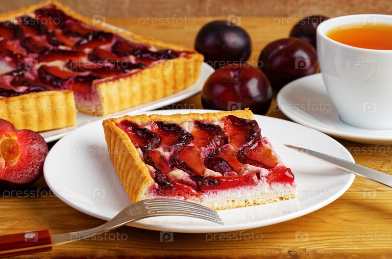 Домашний сливовый пирог и чашка чая на деревянном столе. Мелкий фокус