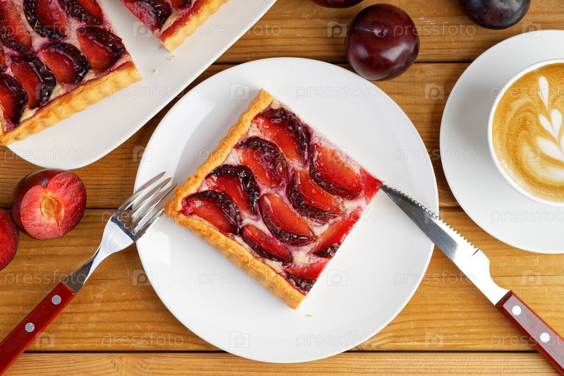 Крупный план домашнего сливового пирога и чашки кофе с капучино на деревянном столе. Вид сверху