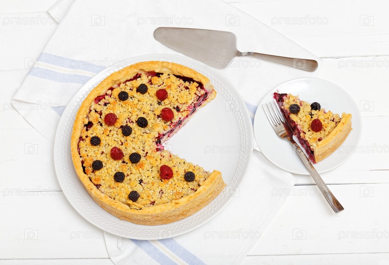 Домашний малиновый пирог с творожным кремом и штрейзелем на белом деревянном столе. Кусочек его и вилка на отдельном блюдце