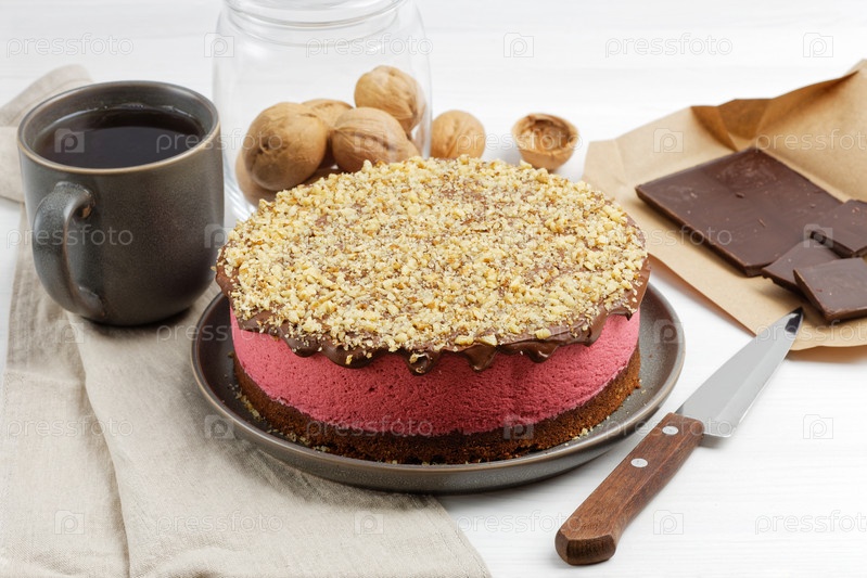 Домашний шоколадный чизкейк с ломтиками миндаля на белом деревянном столе. Вид сверху