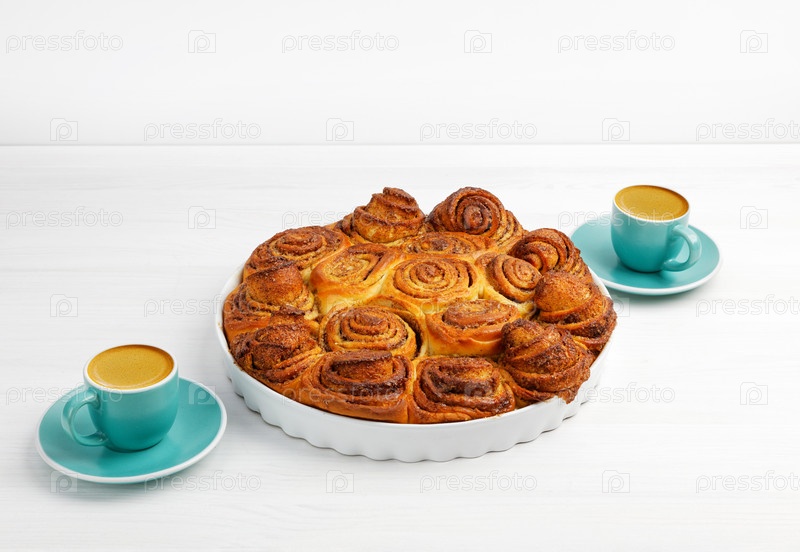 Домашние булочки с корицей из дрожжевого теста и две чашки кофе эспрессо на белом деревянном столе. Копипространство