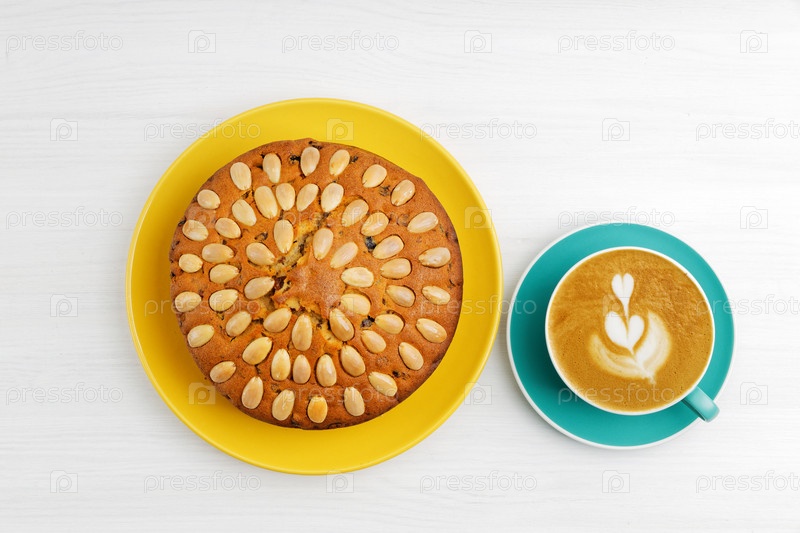 Домашний торт с миндалем и чашкой кофе капучино на белом деревянном столе. Вид сверху