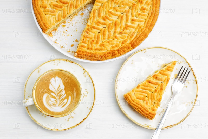 Домашний лимонный пирог с крыжовником и чашка кофе капучино на белом деревянном столе. Вид сверху