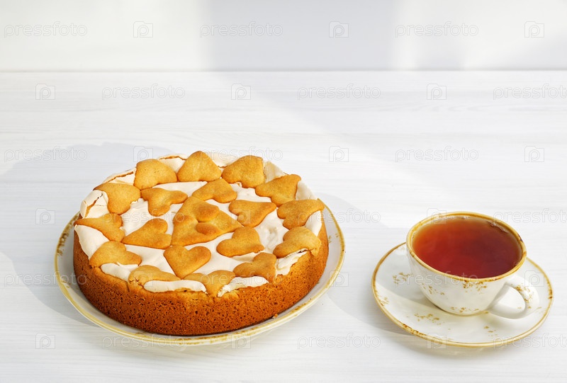 Домашний ягодный пирог с безе и печеньем на белом деревянном столе в солнечных лучах