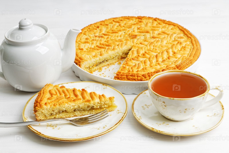 Домашний лимонный пирог с крыжовником и чашка чая на белом деревянном столе