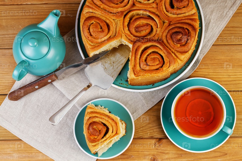 Домашние булочки с корицей из дрожжевого теста и чашка чая на деревянном столе. Вид сверху