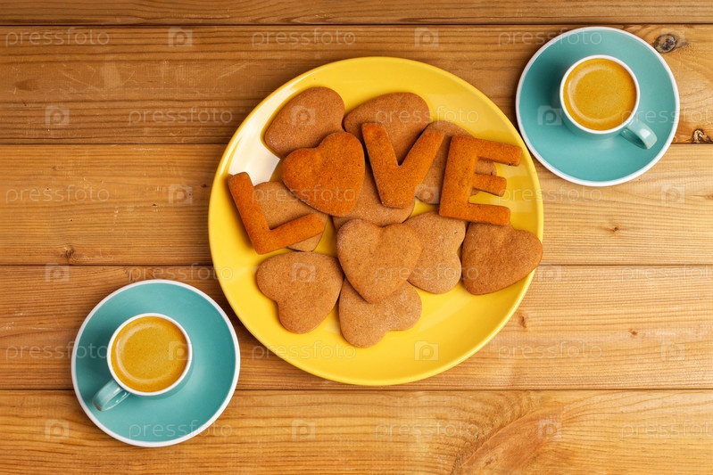 Домашнее печенье в форме сердец и букв «ЛЮБОВЬ» и две чашки кофе эспрессо на деревянном столе. Вид сверху