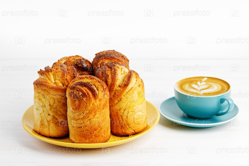 Домашние булочки с корицей из дрожжевого теста и чашка кофе капучино на белом деревянном столе