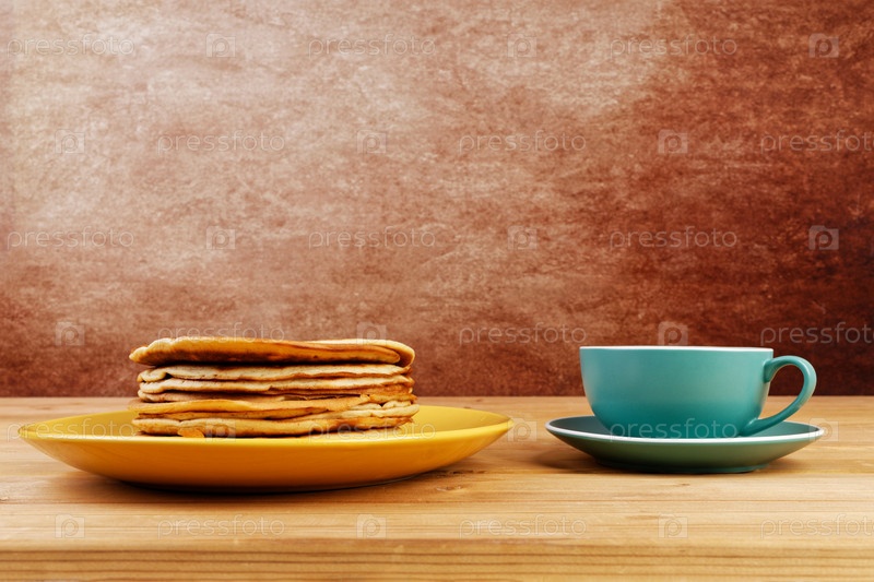 Стопка домашних блинов в желтой тарелке и чашка кофе или чая на деревянном столе. Копипространство