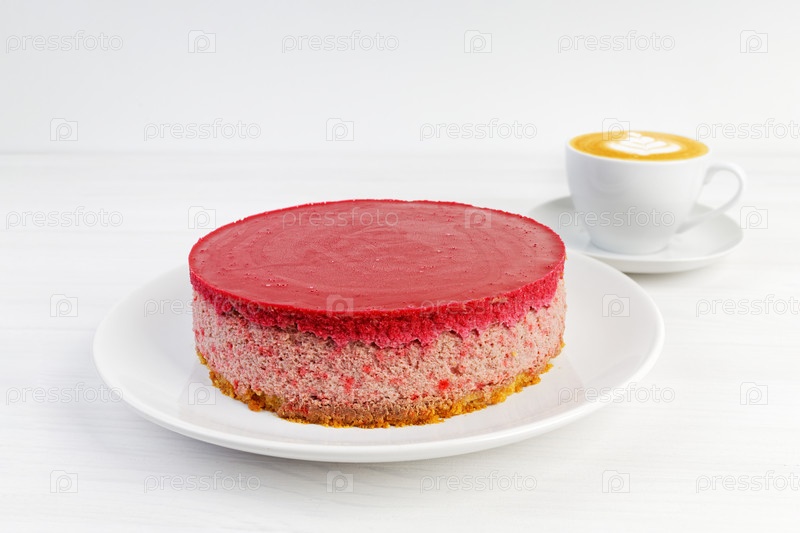 Домашний малиновый и клубничный чизкейк и чашка капучино кофе на белом деревянном столе. Копипространство