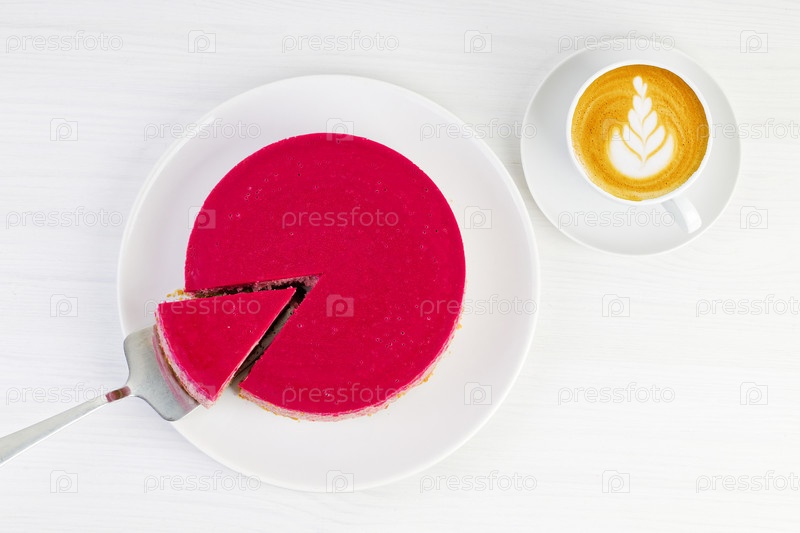 Домашний малиновый и клубничный чизкейк и чашка капучино кофе на белом деревянном столе. Вид сверху