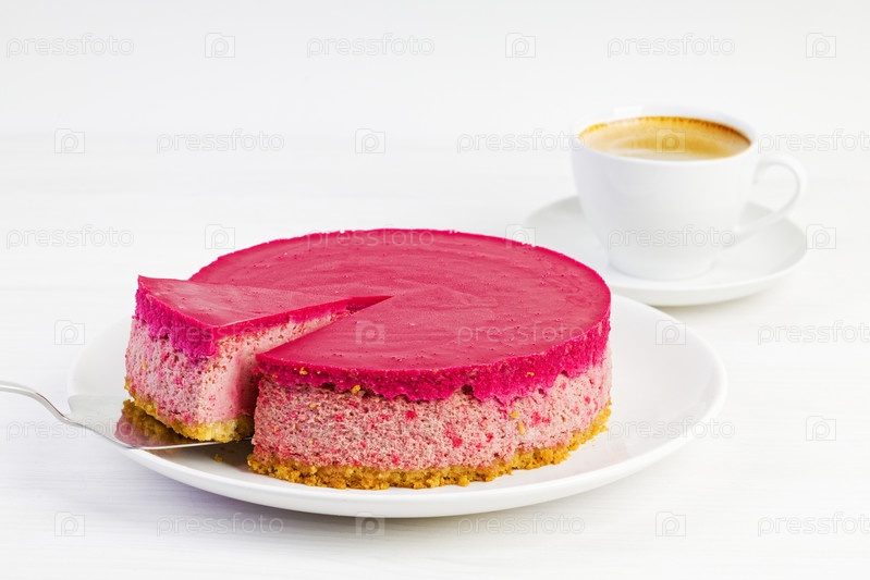 Домашний малиновый и клубничный чизкейк и чашка капучино кофе на белом деревянном столе