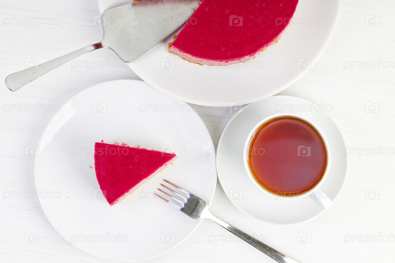 Чизкейк поленики и клубники крупного плана домашний и чашка чая на белом деревянном столе Взгляд сверху. Вид сверху