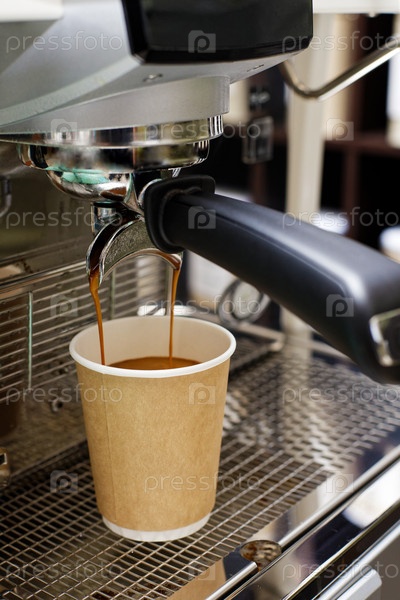 Крупный план наливания эспрессо из кофеварки в картонную чашку