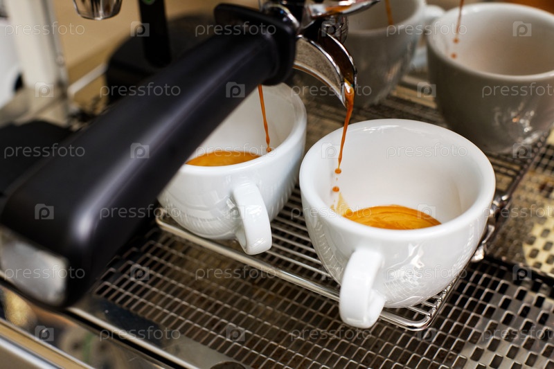 Заваривание кофе в кофемашине. Эспрессо наливают в две чашки