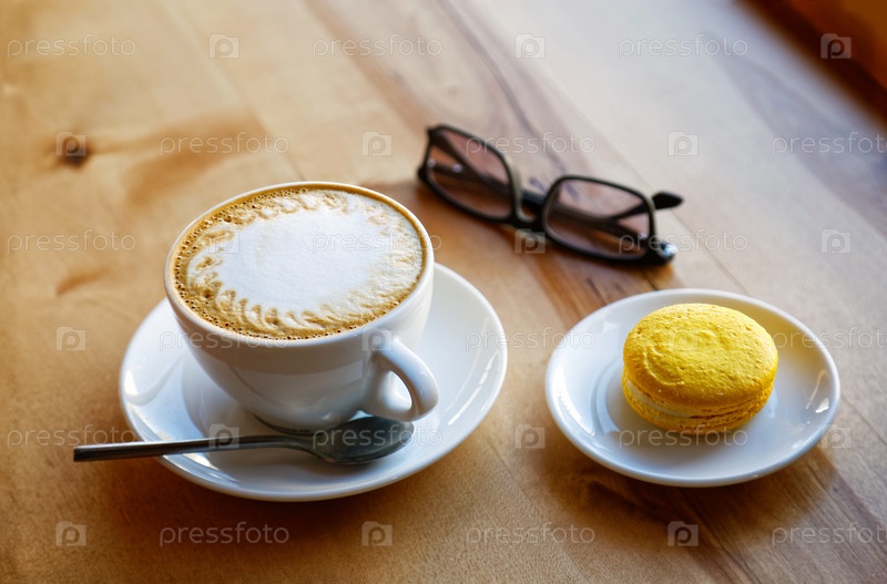 Белая чашка капучино и блюдце с желтым миндальным печеньем