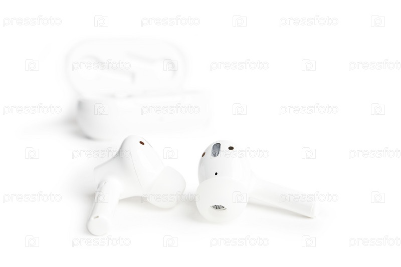 Большой план абстрактные белые наушники TWS (настоящее беспроводное стерео), изолированные на белом фоне
