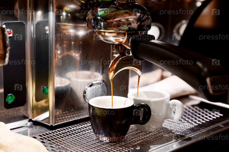 Заваривание кофе в кофемашине. Эспрессо льется в две чашки