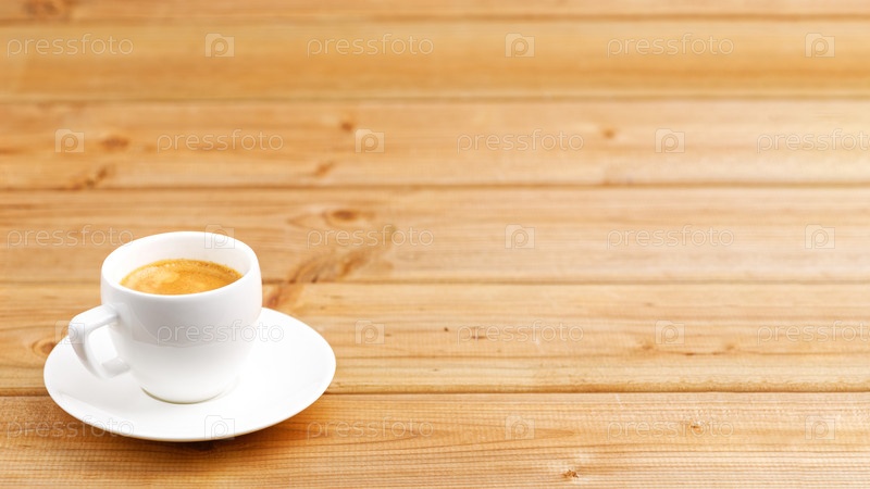 Белая чашка кофе эспрессо на деревянном фоне. Мелкий фокус. Угловой вид с копирайтом