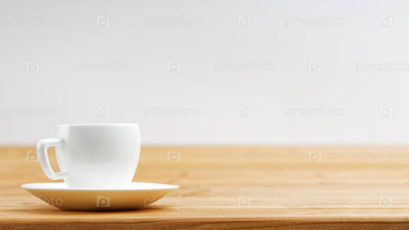 Белая чашка кофе эспрессо на деревянном фоне. Мелкий фокус. Вид спереди с копирайтом
