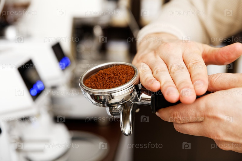 Руки бариста держат портафильтр, наполненный молотым кофе