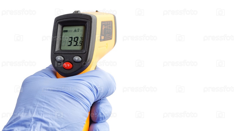 Рука крупным планом в синей медицинской перчатке держит цифровой инфракрасный термометр. Изолированные на белом фоне. Копипространство