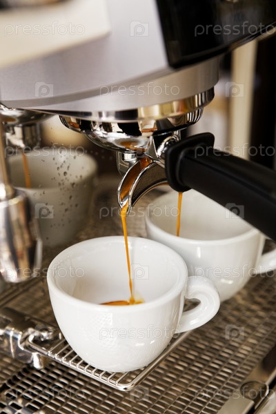 Заваривание кофе в кофемашине. Эспрессо льется в две чашки