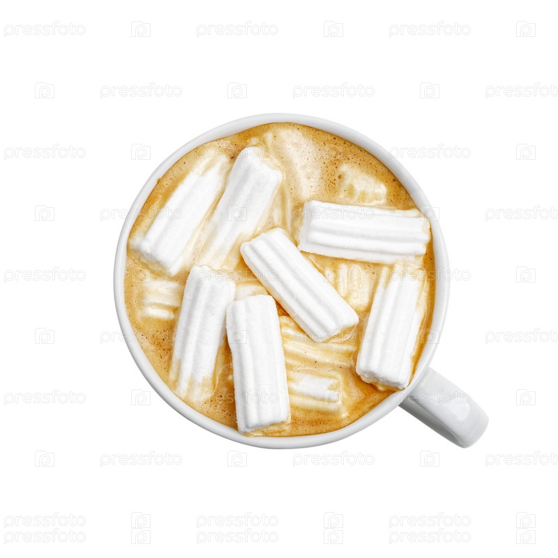 Крупный план белая чашка кофе с зефиром, изолированным на белом