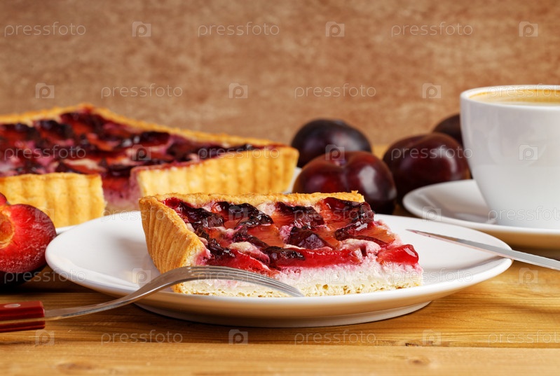 Кусок крупного плана домашнего сливового пирога и чашка кофе на деревянном столе. Мелкий фокус