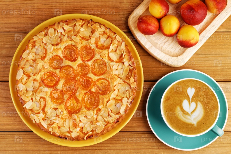 Крупный план домашний пирог с абрикосами и чашкой кофе капучино на деревянном столе. Вид сверху