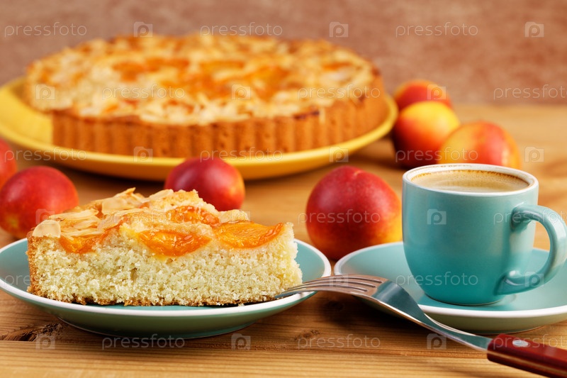 Кусок крупного плана домашнего пирога с абрикосами и чашкой кофе эспрессо на деревянном столе. Мелкий фокус
