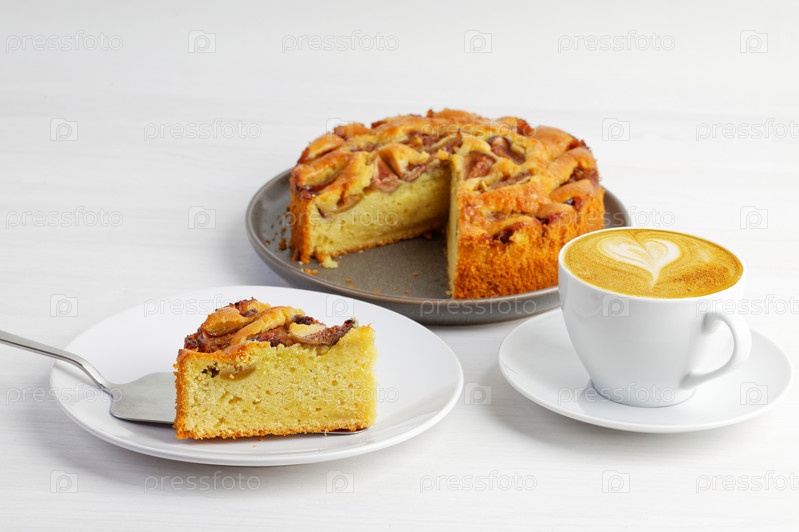 Крупный план домашний рисовый пирог и чашка кофе на белом деревянном столе. Мелкий фокус на кусок пирога