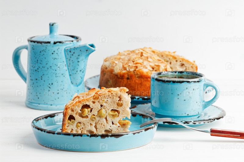 Домашний виноградный пирог и чашка чая на белом деревянном столе. Мелкий фокус