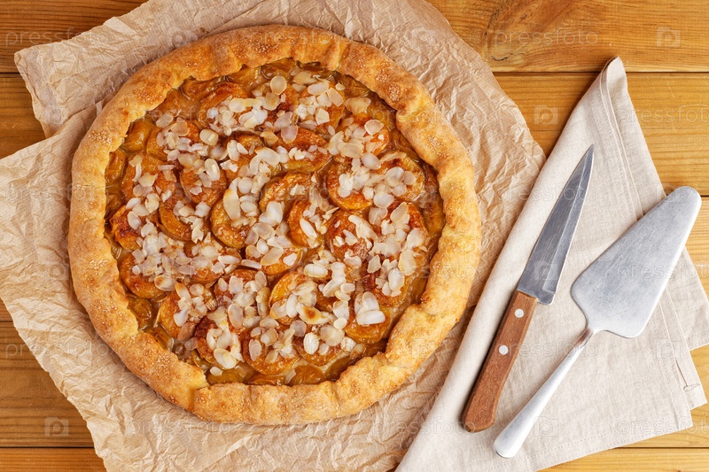 Домашний пирог со сливами и миндальными лепестками на пергаментной бумаге. Вид сверху