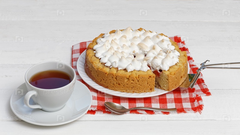 Сладкий торт, украшенный безе и чашкой чая