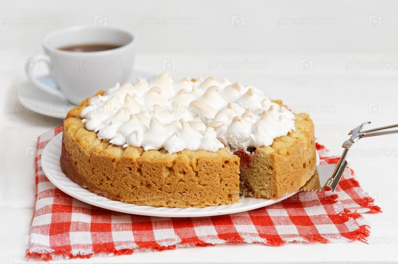 Сладкий торт, украшенный безе и чашкой чая