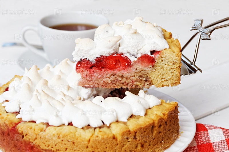 Крупный план домашнего сладкого пирога с клубникой и безе