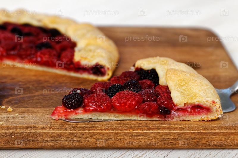 Крупный план домашней галетты с красной и черной малиной на деревянной разделочной доске. Мелкий фокус