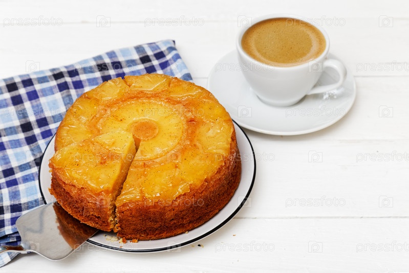 Ананасовый перевернутый ананасовый пирог и чашка кофе на белой деревянной вкладке