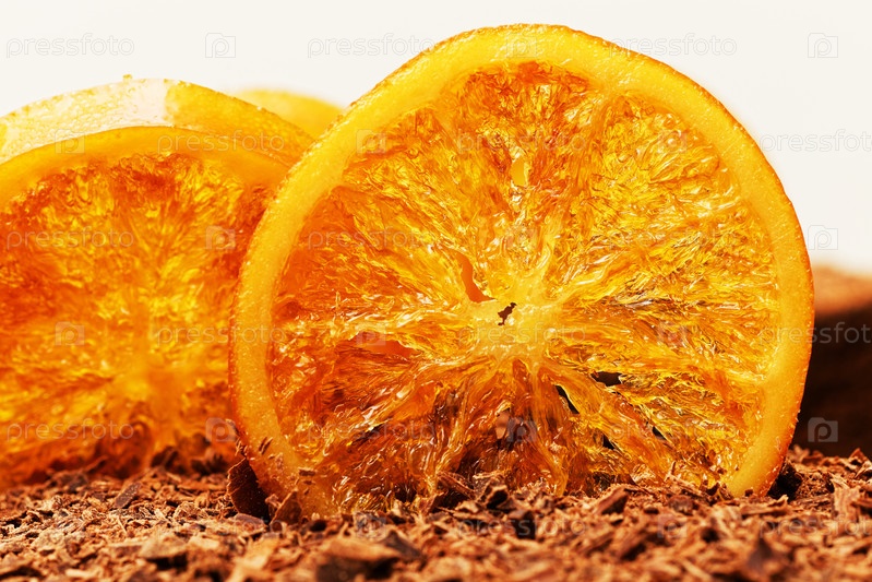 Крупный план кусочков карамелизированного апельсина поверх шоколадного торта