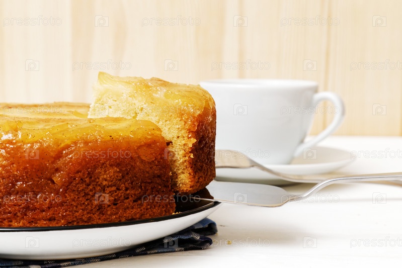 Ананасовый перевернутый ананасовый пирог и чашка чая